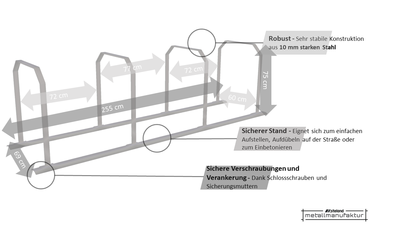 Der Fahrradständer kann ohne Boden-Befestigung aufgestellt werden. Er steht sicher und stabil.