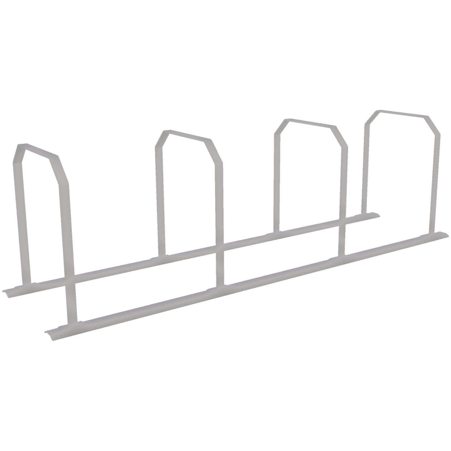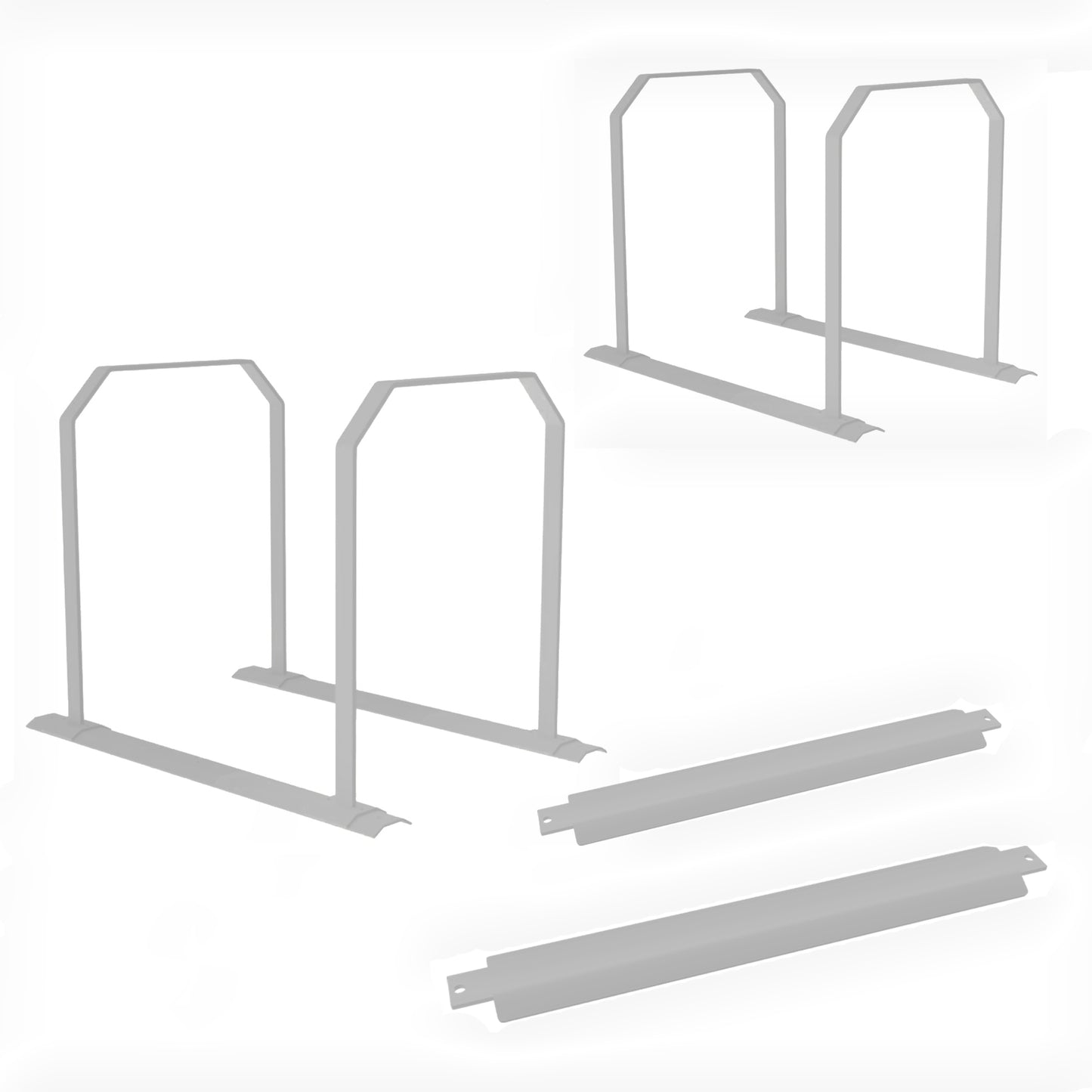 Werden 2 Fahrradständer für je 4 Fahrräder benötigt, so lassen sich beide mit der Verbindungsstrebe kombinieren. In diesem Doppelsystem für 8 Fahrräder ist die Verbindungsstrebe bereits enthalten.